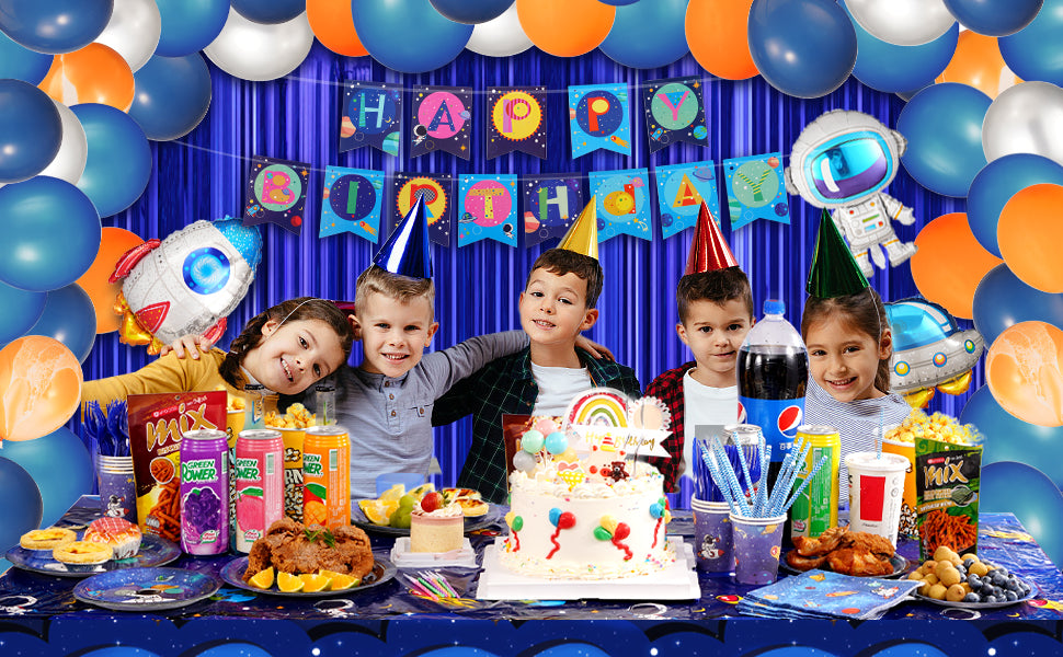3x Folienballons Raumschiff UFO, Rakete und Astronaut, 80x Latexballon, 2 x blaue Fransenvorhänge, 16 x Partygeschirr-Set zum Thema Weltraum: 16 x 9-Zoll-Teller, 16 x 7-Zoll-Teller, 16 x Becher, 16 x Einwegstrohhalme, 16 x Gabel, 16 x Messer, 16 x Serviette + 1x Tischdecke.
