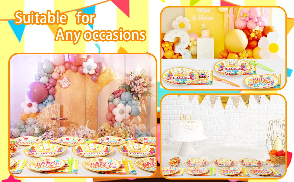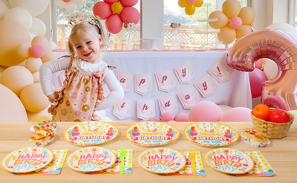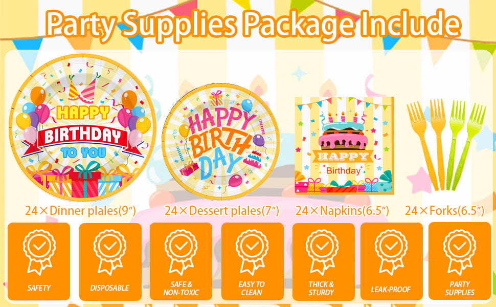 24 assiettes jaunes de 9 pouces sur le thème d'anniversaire, 24 assiettes à dessert de 7 pouces, 24 serviettes et 24 fourchettes en plastique.